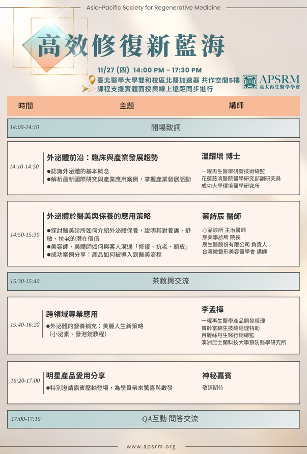 💬適合對象:醫美從業人員、美容師、髮型設計師、銷售顧問、講師、想切入外泌體市場的保養品牌夥伴