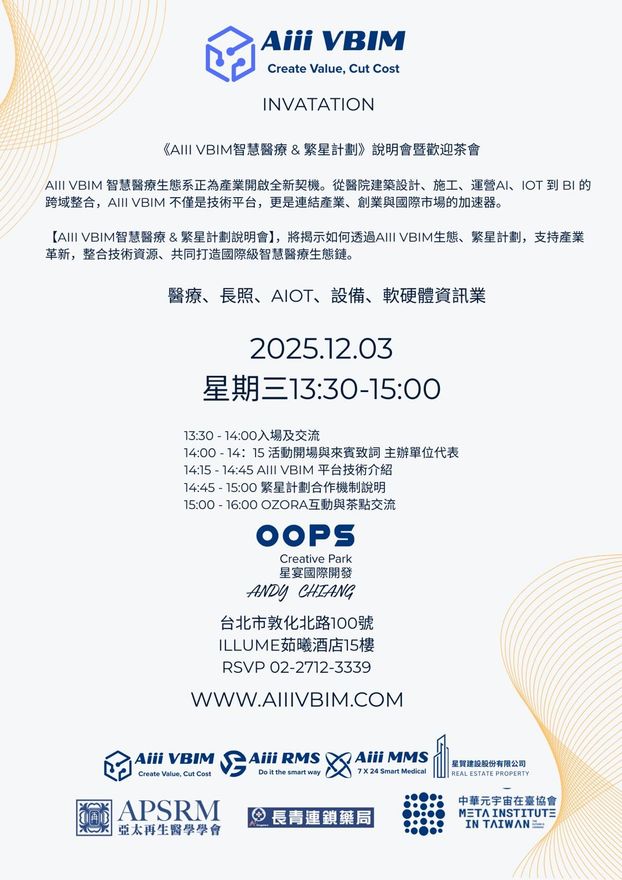 【Aiii VBIM智慧醫療 & 繁星計劃說明會】將揭示如何透過Aiii VBIM 生態、繁星計劃,支持產業革新,整合技術資源、共同打造國際級智慧醫療生態鏈。